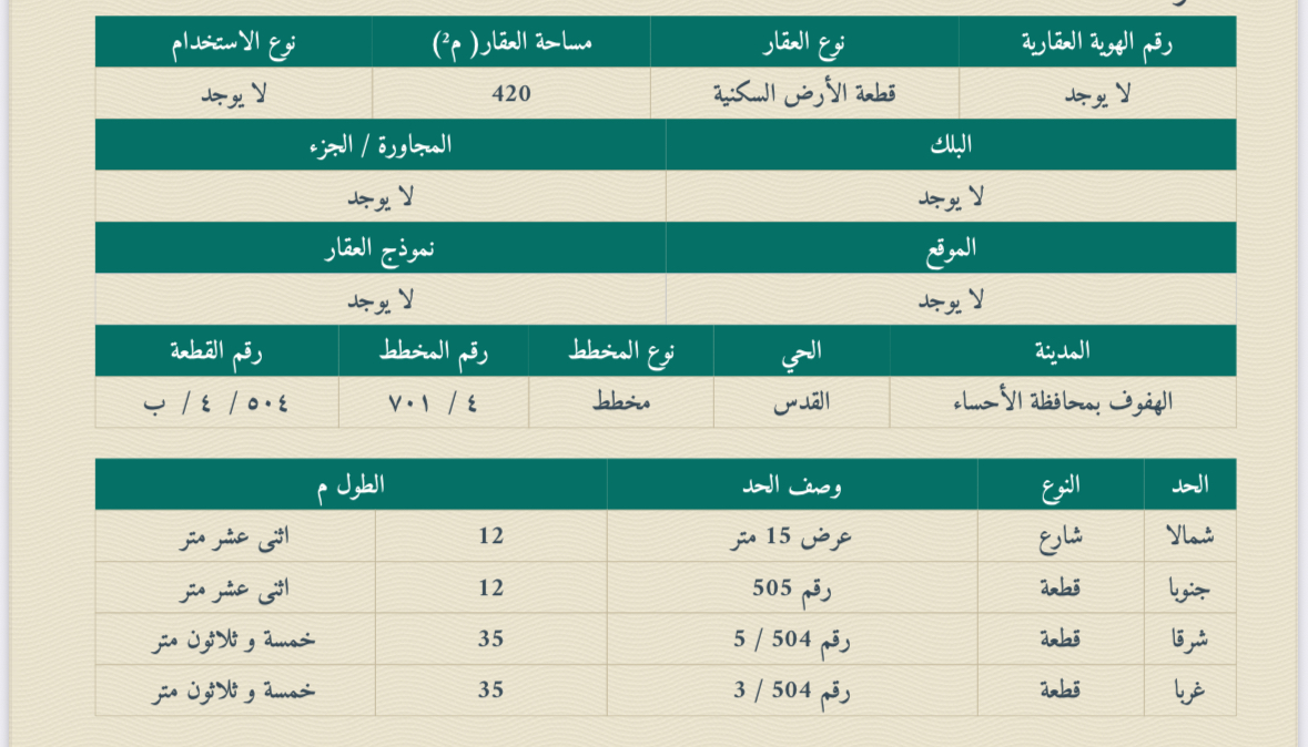 التفاصيل | القدس (1031/4) 5/504/ب | المساحة420م شارع15 | المتر950.00 14/09/2025 |