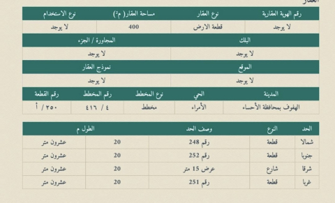 التفاصيل | الامراء (416/4) 123/أ | المساحة400م شارع15 | على السوم 04/11/2025 |