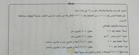 التفاصيل | جنوب المنسوب (253/4) 106/أ | المساحة455م شارع15*12 | حد المتر900.00 05/03/2026 |