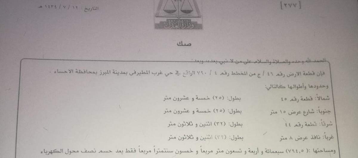التفاصيل | بستان المطيرفي (790/4) 1/107 | المساحة518م شارع25*15 | حد للمتر 1,750.00 09/08/2025 |