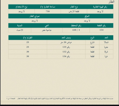 التفاصيل | الضاحية الحي التاسع 184/ب | المساحة750م شارع15 شمال | السعر365,000.00 02/10/2025 |