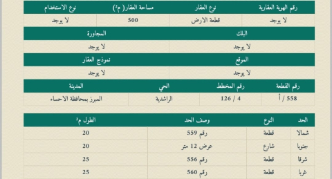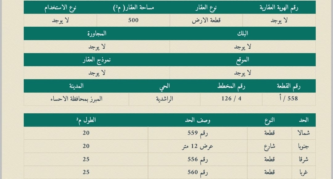 التفاصيل | الراشدية (126/4) 578 & 580/ب | المساحة500م شارع12 | حد للمتر 2,000.00 25/02/2026 |