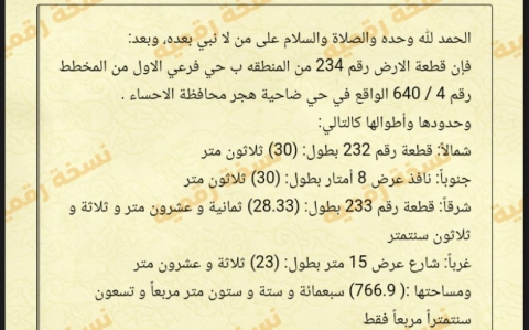 التفاصيل | الضاحية الحي الاول (640/4) 671/ج | المساحة774م شارع15 شرق | الحد600,000.00 16/02/2026 |