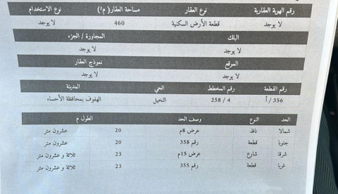 التفاصيل | النخيل بالجشه 198/أ | المساحة441م شارع15 | السعر430,000.00 05/02/2026 |