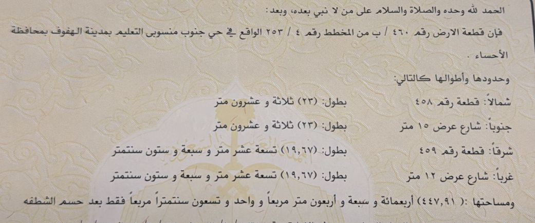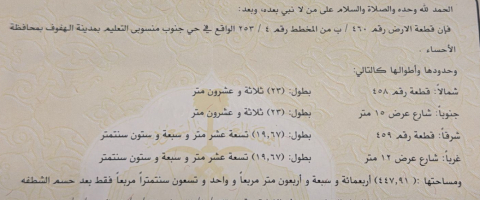 التفاصيل | جنوب المنسوب (253/4) 106/أ | المساحة455م شارع15*12 | حد المتر900.00 05/03/2026 |