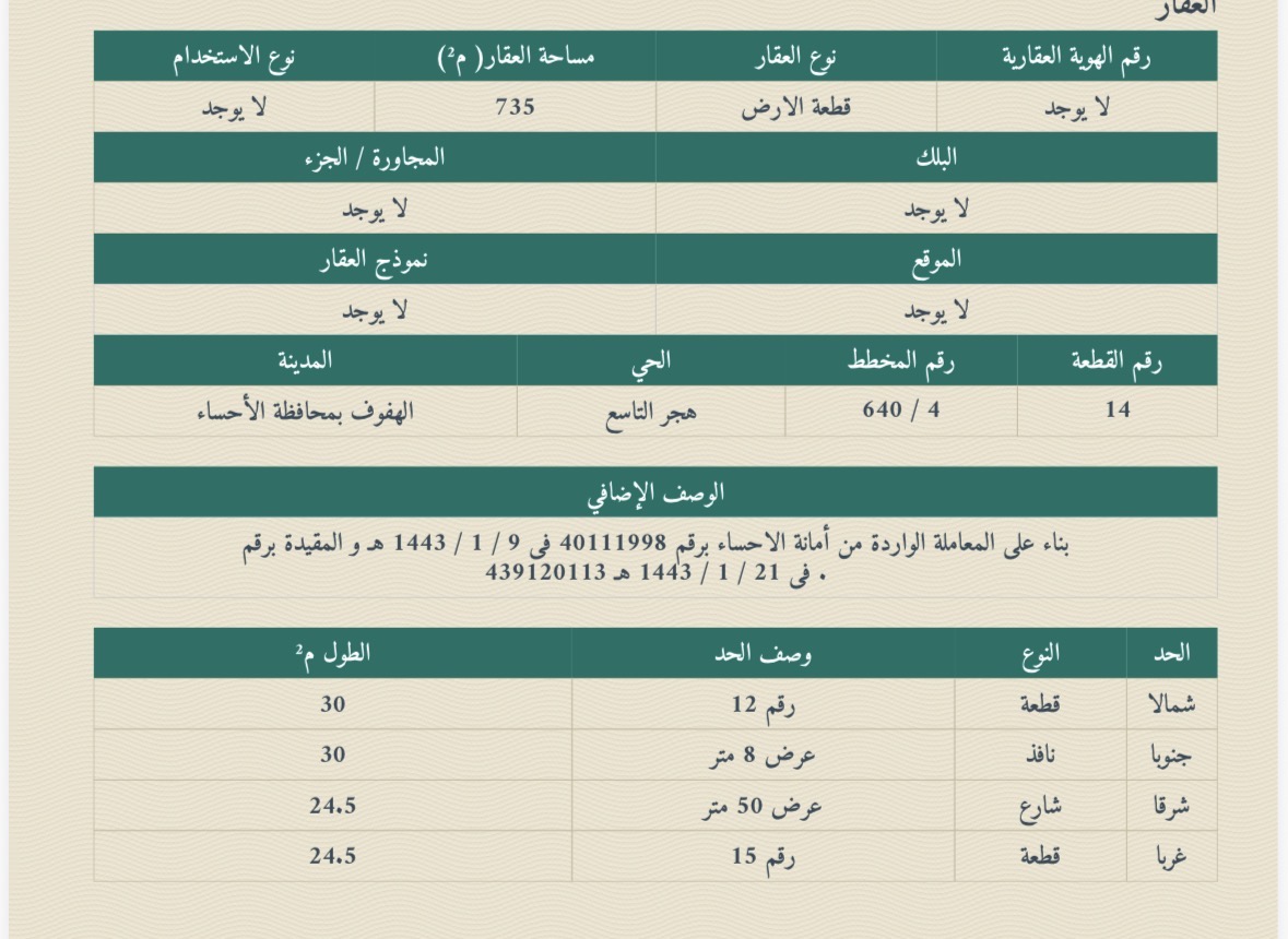 التفاصيل | الضاحية الحي التاسع 318/أ | المساحة625م شارع15 | السعر370,000.00 18/02/2026 |