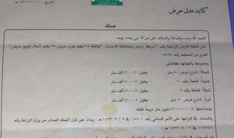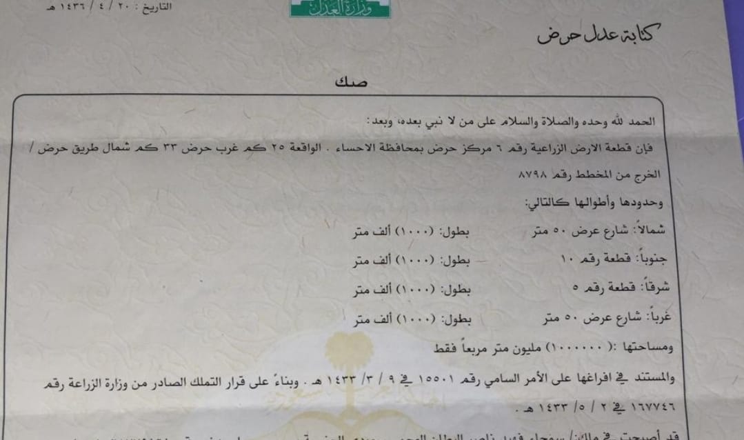 التفاصيل | حرض 2 | المساحة1,000,000م شارع50 | على السوم 15/04/2026 |