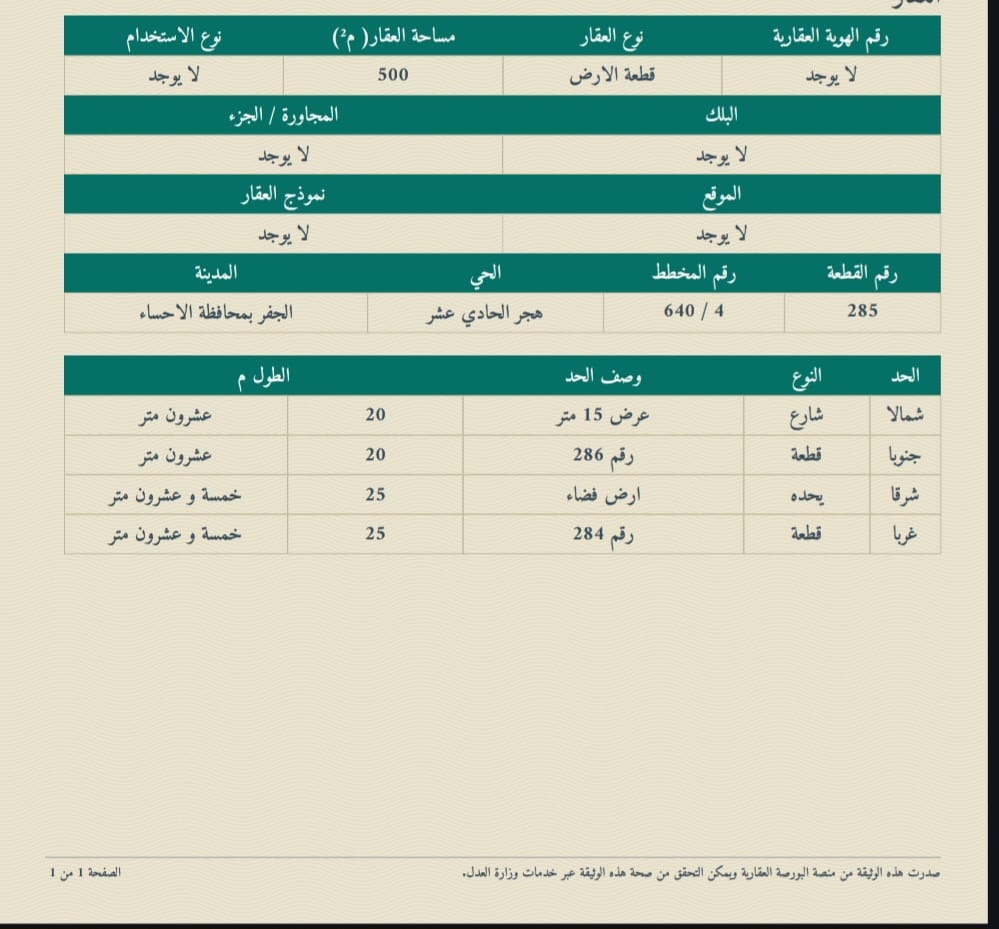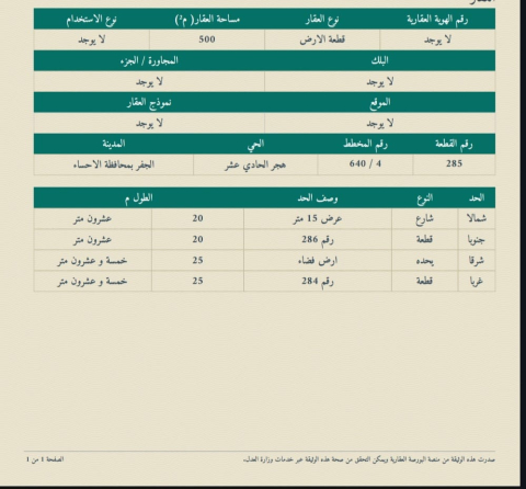 التفاصيل | مخطط التعاون ( الاسكان ) 640/4 82/و | المساحة495م شارع15*15 | السعر400,000.00 30/11/2025 |