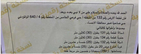 التفاصيل | الضاحية الحي الخامس (640/4) 576/ب | المساحة927م شارع15 شرق | الحد600,000.00 16/02/2026 |