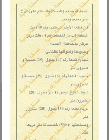 التفاصيل | حرض 331/ب | المساحة400م شارع15 شمال | على السوم 18/10/2025 |