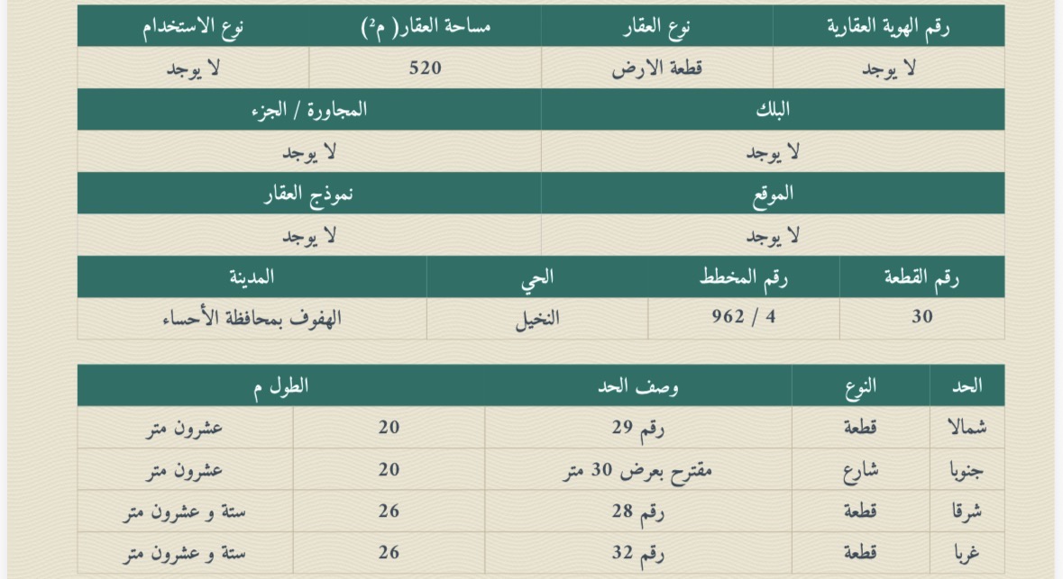 التفاصيل | شرق حي الملك فهد 18 | المساحة667م شارع20* نافذ 8 | المتر1,550.00 15/04/2026 |