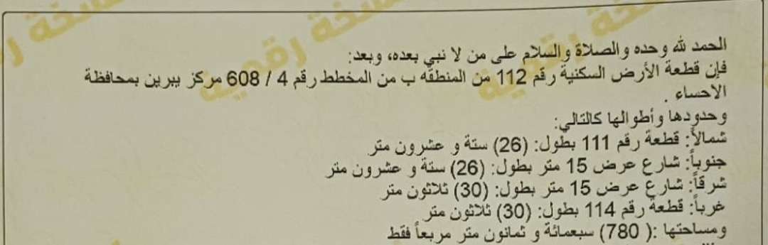 التفاصيل | يبرين 608/4 111 | المساحة800م شارع30 شرق | السعر135,000.00 06/07/2025 |