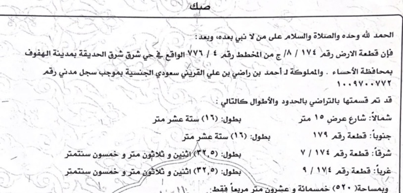 التفاصيل | شرق شرق الحديقة 389/أ | المساحة780م شارع15 شمال | المتر1,050.00 16/02/2026 |
