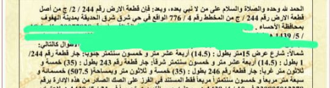 التفاصيل | شرق شرق الحديقة 389/أ | المساحة780م شارع15 شمال | المتر1,050.00 16/02/2026 |