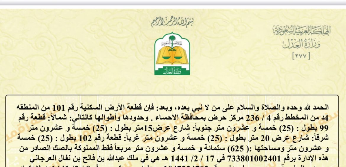 التفاصيل | حرض 331/ب | المساحة400م شارع15 شمال | على السوم 18/10/2025 |