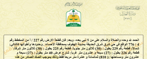 التفاصيل | شرق شرق الحديقة 2/261/ج | المساحة438م شارع15 | الحد380,000.00 07/03/2026 |