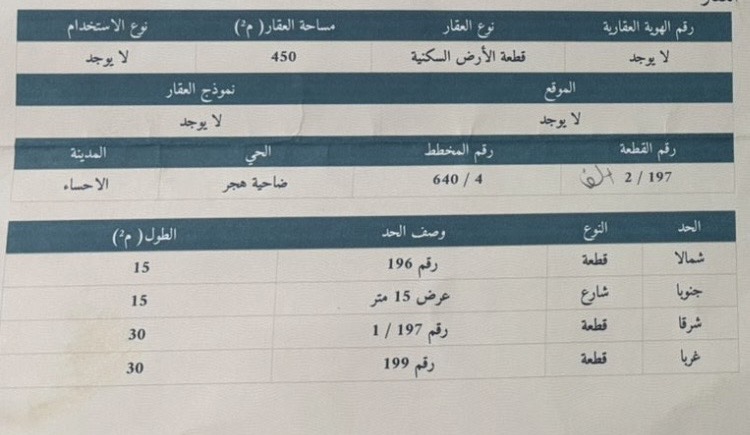 التفاصيل | الضاحية الحي السادس (640/4) 1/197/أ | المساحة450م شارع15 | السعر على السوم 04/04/2026 |