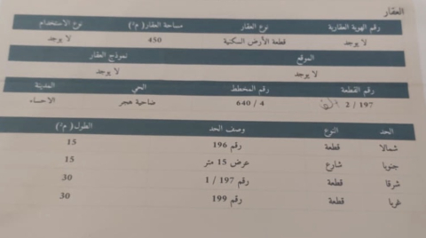 التفاصيل | الضاحية الحي السادس (640/4) 1/197/أ | المساحة450م شارع15 | السعر على السوم 04/04/2026 |